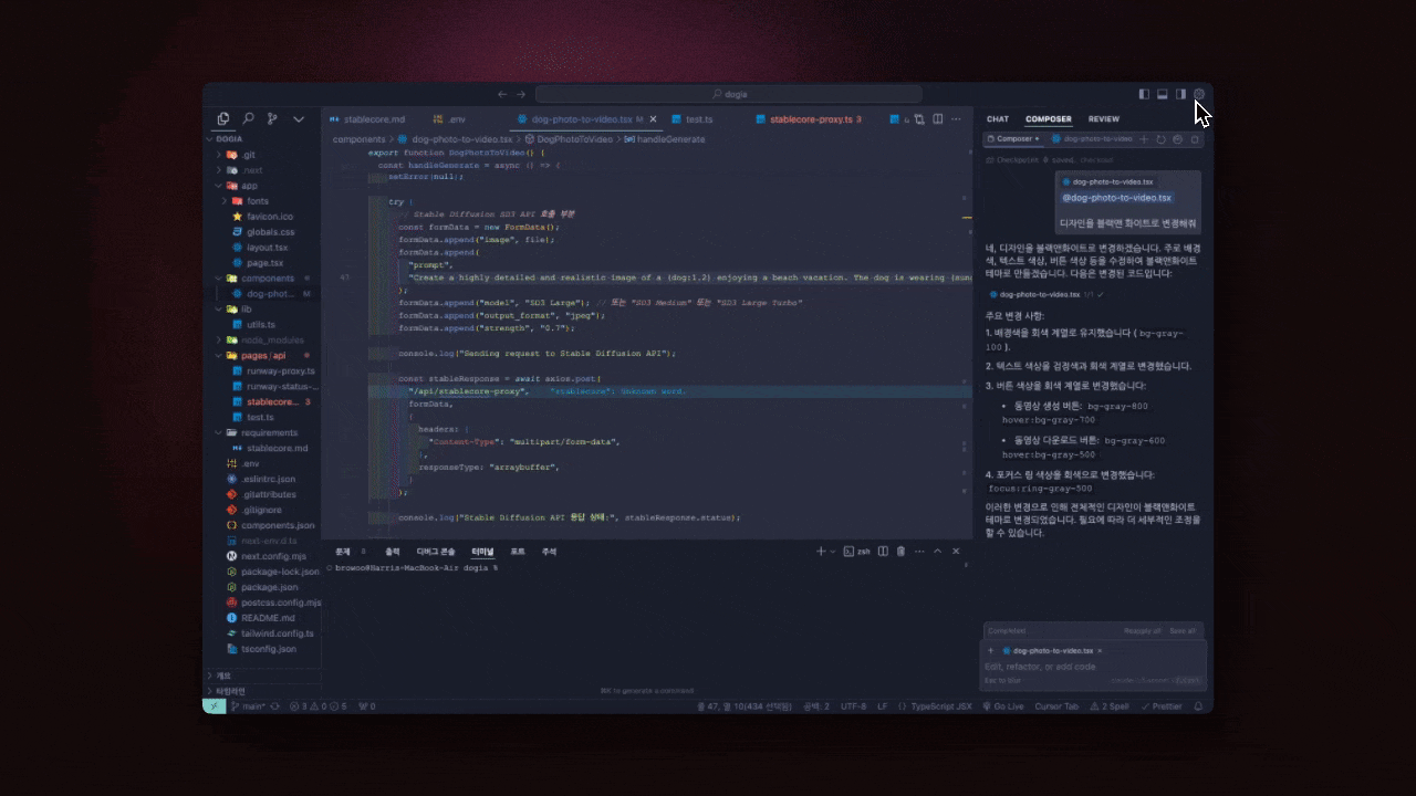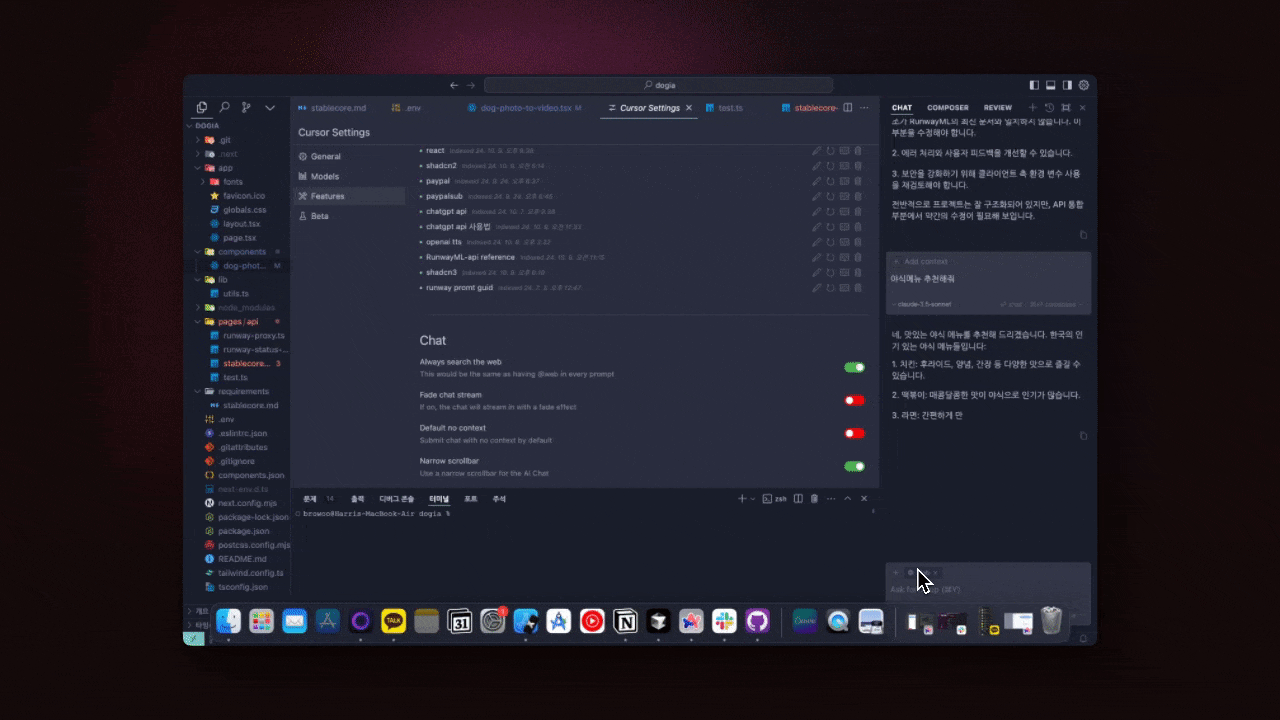 - 사용 목적: Chat은 빠른 질문이나 설명 및 디버깅에 유용하고, Composer는 대규모 코드 생성이나 리팩토링에 더 적합해요.