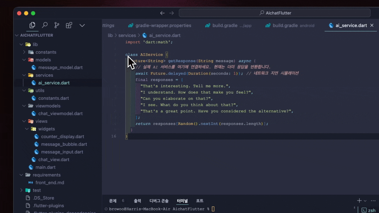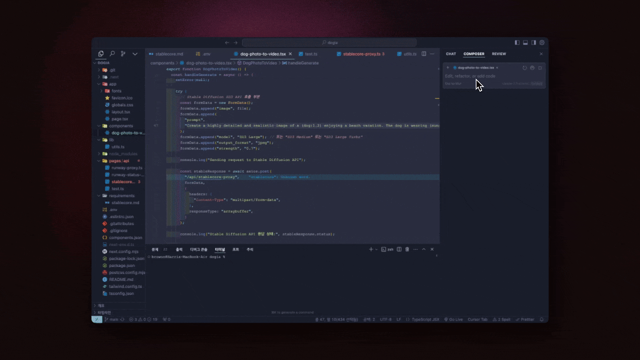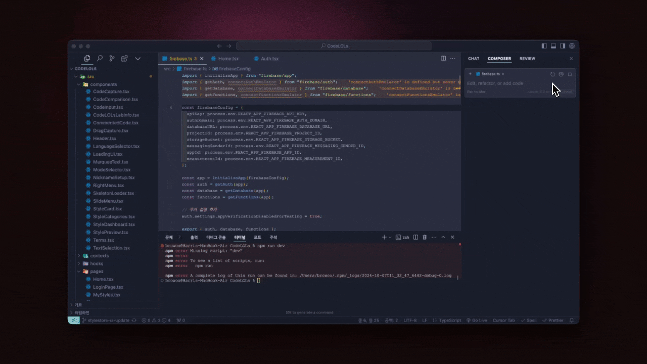 이럴 때 터미널에서 Add to Chat 또는 Add to Composer 기능을 활용하면 터미널 오류를 쉽게 확인하고 수정할 수 있어요. 이 기능을 사용하면 번거롭게 복사 붙여넣기할 필요 없이 버튼 하나로 오류를 수정할 수 있어 정말 편리해요.